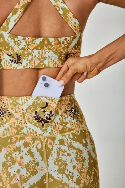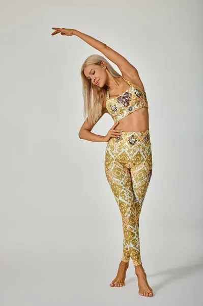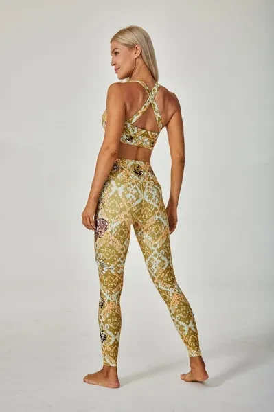 The 'Jubar' print showcases a golden backdrop embellished with Native American geometric patterns, complemented by symbolic elements including elephants, the moon, plants, and gemstones. These symbols all convey themes of wisdom and enlightenment. The elephant, moon, and gemstones symbolize inner brilliance and intellect. The ‘Jubar print is designed to assist you in connecting with your inner wisdom during meditation or yoga sessions, allowing you to tap into your strength.