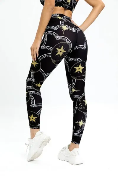 Pattern Description: 'Golden Star' is a celebration of female strength, resilience, and brilliance, shining a light on the limitless potential and extraordinary beauty of women. Against a background of deep black, sparkling golden stars and a glowing moon shine bright. These celestial elements are joined together by wispy, abstracted grey clouds, symbolizing the many challenges that women have overcome on their journey towards empowerment and equality. Product Features: High-waisted design perfectly shapes, supports and flatters any body types No small elastic band at the top No side seams for extra flattering fit and comfort Pair it with our matching Golden Star Weave Back Bra for a totally unique and dreamy look Fabric: Made with 84% RPET and 16% spandex from recycled plastic bottles and it is 100% recyclable! - Four-way stretch, breathable and anti-bacterial.