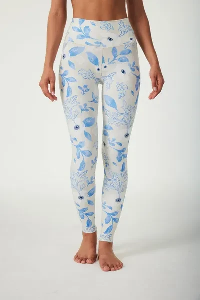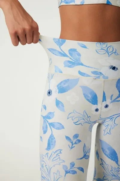Pattern Description: Inspired by Bandari's "Dream Garden", Our designer captured the purest essence of its melodic tones and turned it into delicate blue flowers with fluid curves and lines with an elegant apricot backdrop, creating a clean and pristine aesthetic. The overall colour palette exudes an elevated sense of refinement. Infused with a touch of feminine elegance and purity, our pattern reflects the noble qualities of women! Product Features: High-waisted design perfectly shapes, supports and flatters any body types No small elastic band at the top No side seams for extra flattering fit and comfort Pair it with our matching Bandari Weave Back Sports Bra for a totally unique and dreamy look Fabric: Made with 84% RPET and 16% spandex from recycled plastic bottles and it is 100% recyclable! - Four-way stretch, breathable and anti-bacterial. Model Info: Melania // Height: 5'9  // Bust 33.1” //  Waist 23.6” // Hips 39.0” // SILVERWIND size S in tops & bottoms