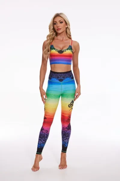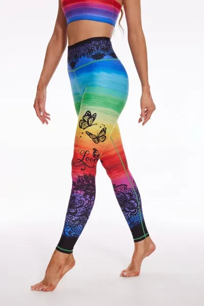 Pattern Description: This pattern features a classic rainbow stripe background with a unique gradient painterly effect, creating a stunning sky-like pattern. The edges are adorned with black lace floral decorations, adding an element of intricacy and elegance. It represents the unique charm of the LGBTQ community and their commitment to self-expression and individuality. At the bottom, black lace butterflies dance around the word "love" with the colorful background, symbolizing the LGBTQ community's desire and pursuit of love.  The pattern allows you to feel the essence of freedom and love, empowering you with the strength of the LGBTQ community, and encouraging you to embrace your unique charm. Product Features: High-waisted design perfectly shapes, supports and flatters any body types. No small elastic band at the top. Two side pockets for essentials. No side seams for extra flattering fit and comfort. Stretchy and light fabric for a smoothing, second-skin feel. Fabric: Made with 84% RPET and 16% spandex from recycled plastic bottles and it is 100% recyclable! - Four-way stretch, breathable and anti-bacterial. Model Info: Poli//Height: 5'7 // Bust 33.5” // Waist 23.6” // Hips 35” //SILVERWIND size Regular S