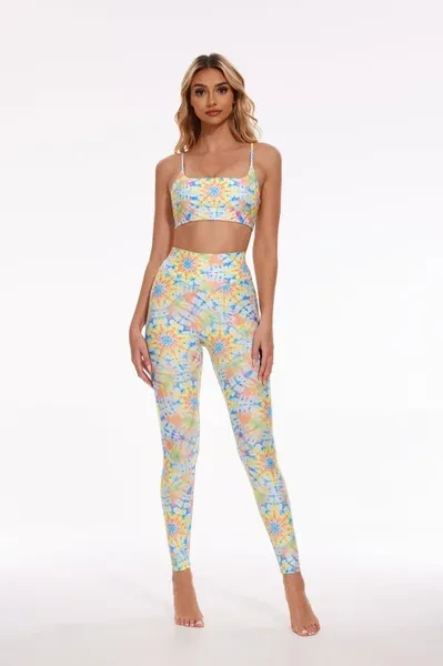Pattern Description: The pattern design incorporates the traditional Eastern tie-dye technique, showcasing a unique artistic style and a sense of mystery. Within the vibrant seamless pattern, numerous small geometric shapes intertwine, creating a flowing and dynamic visual effect. Primarily in yellow and blue hues with accents of green and pink, it's like a beautiful and crystal lattice, evoking a refreshing and peaceful atmosphere. The central point symbolizes the radiant center of the universe and the power of unity, resulting in a harmonious overall design. Combined with the designs of radiance and starry skies, it makes your workouts no more dull and monotonous. Product Features: High-waisted design perfectly shapes, supports and flatters any body types. No small elastic band at the top. Two side pockets for essentials. No side seams for extra flattering fit and comfort. Stretchy and light fabric for a smoothing, second-skin feel. Fabric: Made with 84% RPET and 16% spandex from recycled plastic bottles and it is 100% recyclable! - Four-way stretch, breathable and anti-bacterial. Model Info: Evy// Height: 5'8 // Bust 33.9” // Waist 24.4” // Hips 36.6 //SILVERWIND size Regular S